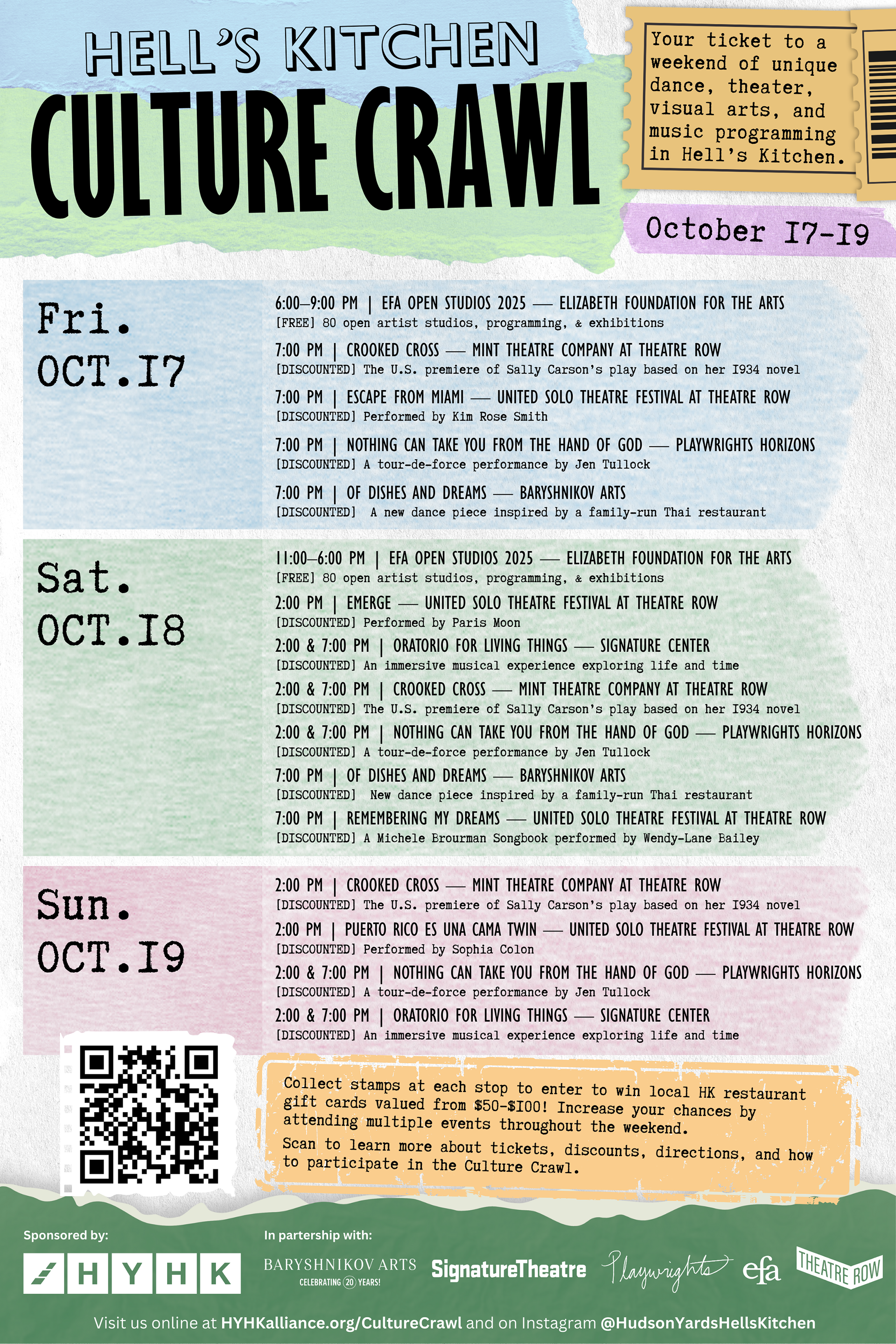 The Culture Crawl is a three-day arts and culture festival highlighting Hell’s Kitchen’s vibrant creative community. Partnering with HYHK Alliance, I developed a visual identity and collateral system that celebrates the neighborhood’s diversity and energy while maintaining consistency across formats.
